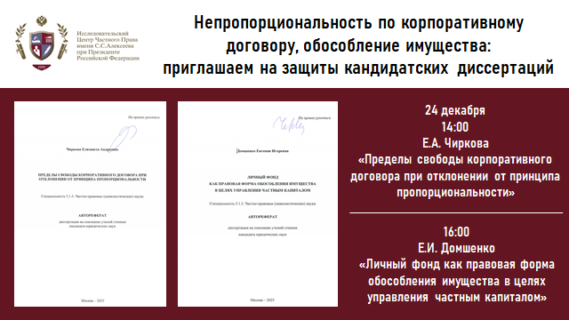 Непропорциональность по корпоративному договору, обособление имущества: приглашаем на защиты кандидатских диссертаций