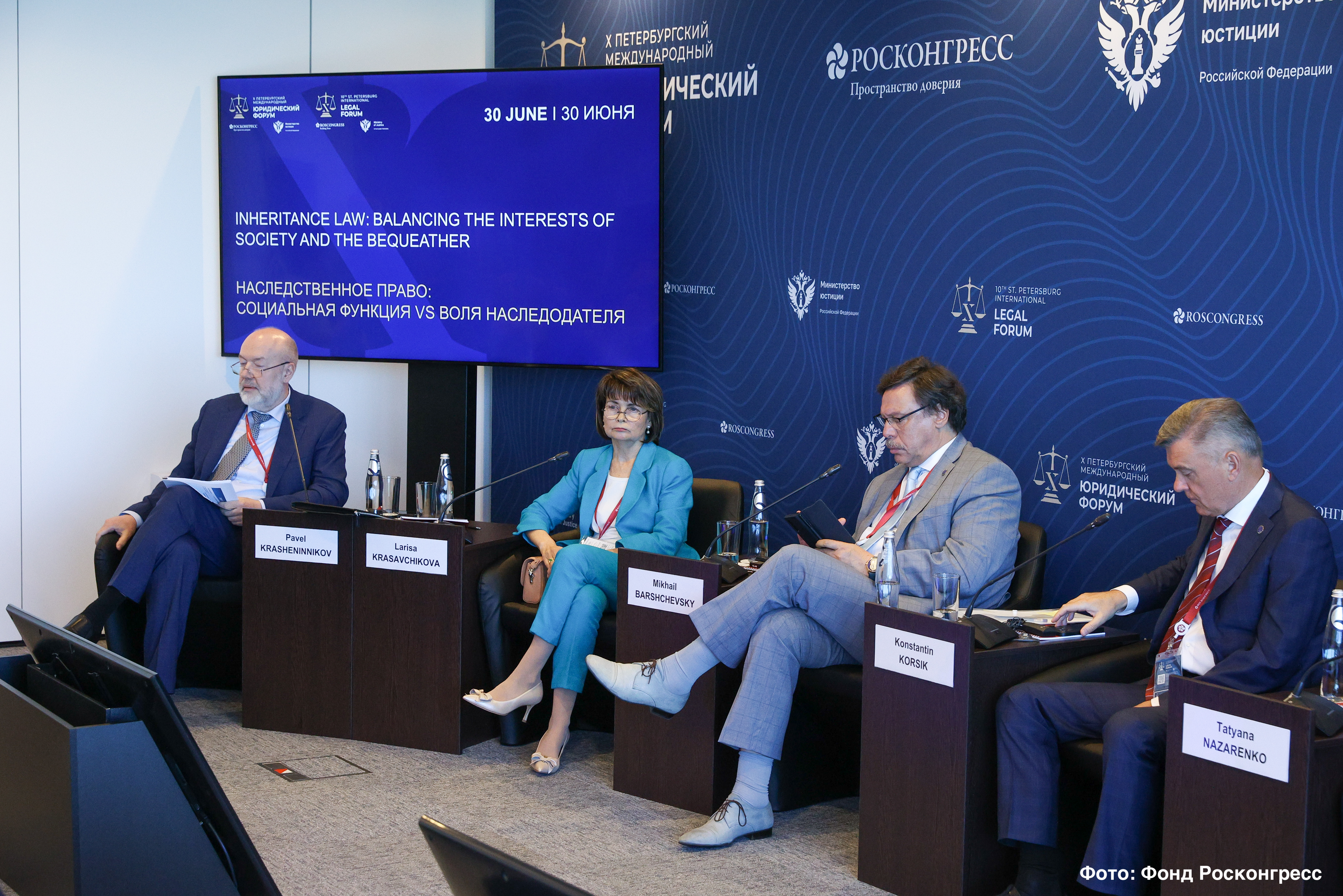30 июня состоялась секция «Наследственное право: социальная функция vs воля наследодателя». Спикеры говорили о соотношении между алиментным содержанием и наследованием по закону, о роли наследственных фондов в обеспечении примата воли наследодателя. В рамках сессии выступили с докладами судья КС РФ Л.О. Красавчикова, президент ФНП К.А. Корсик, судья ВС РФ Т.Н. Назаренко, испанский адвокат Д. Виадер и др. Модератором был председатель Совета при Президенте РФ по кодификации и совершенствованию гражданского законодательства П.В. Крашенинников.